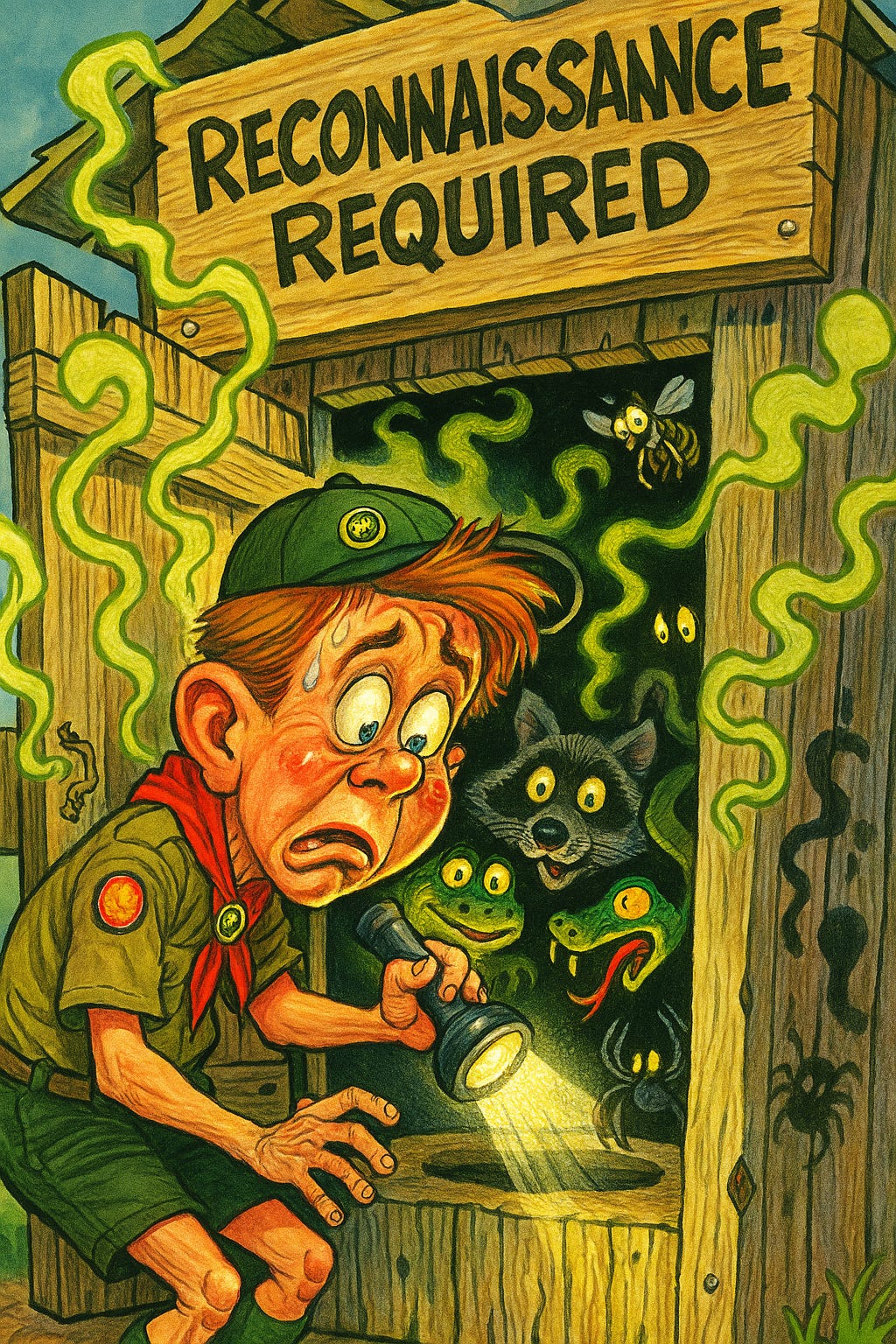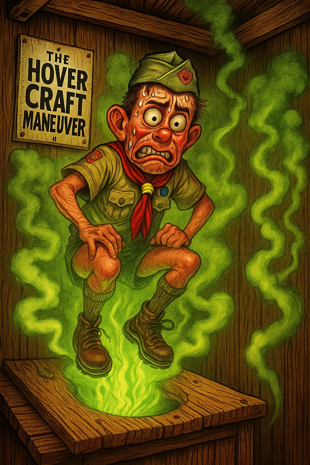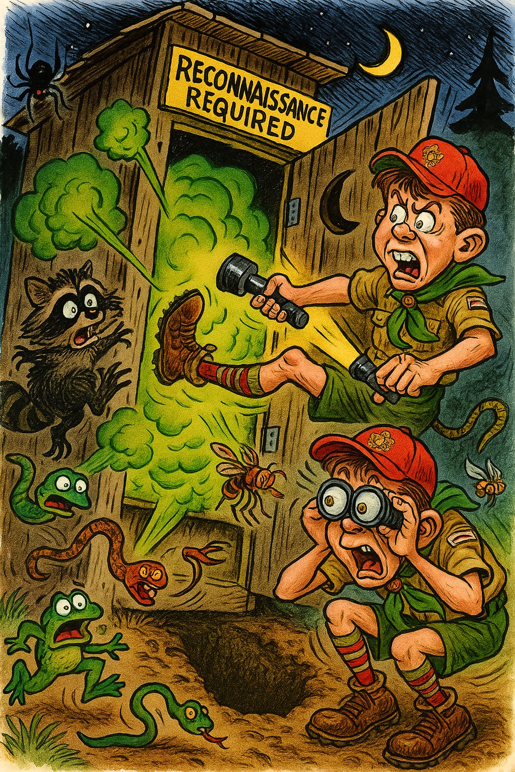 The real test of a Scout’s bravery? Forget tying knots, building a lean-to or surviving a night in the wilderness; the true mark of a seasoned Scout was making it in and out of that wooden deathtrap with all bodily functions and dignity intact, especially after the canteen chili cook off. 💀💨