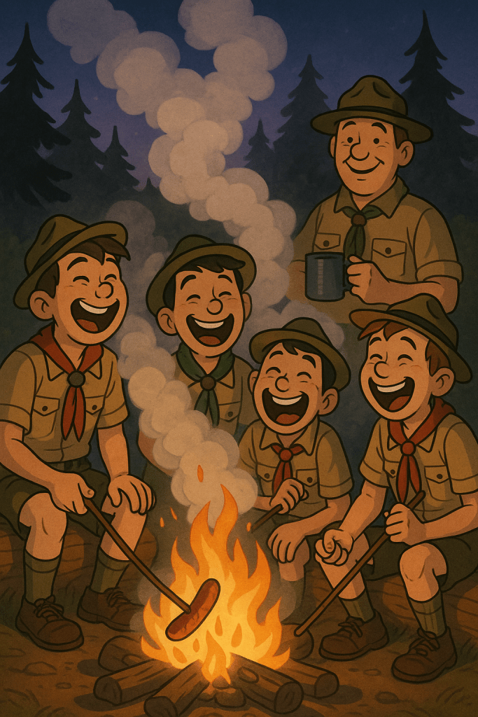 Scouts laughing as one tries to burp the alphabet while another measures a spit contest. Nostalgic cartoon of Scouts competing in harmless, funny games — burping, spitting, and laughing in the woods.