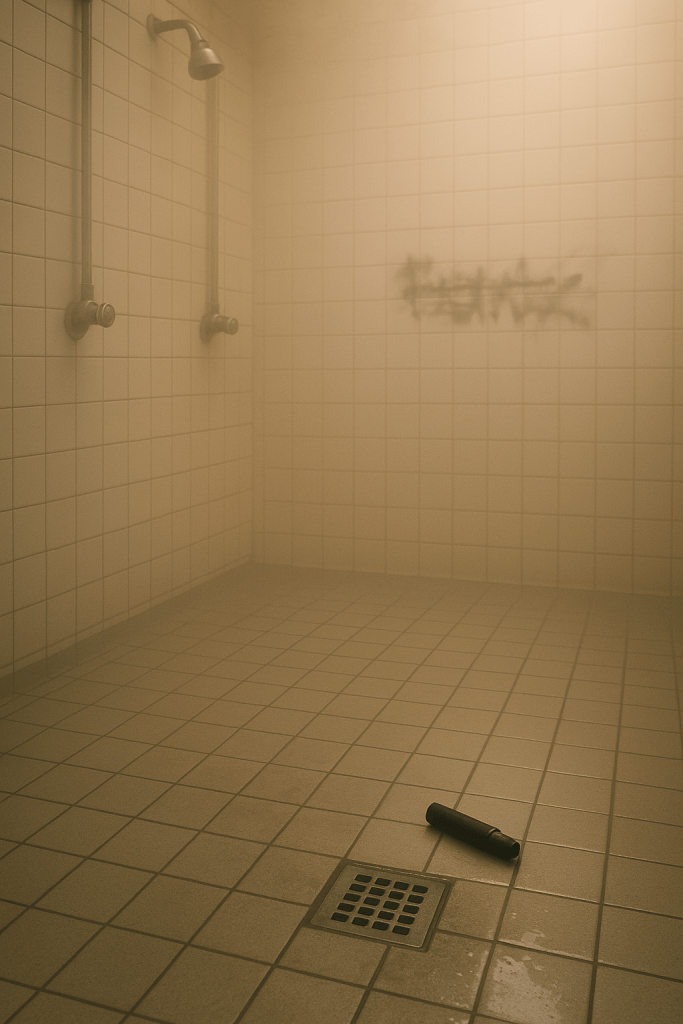 Panicking, Kyle grabs his towel and tries to wipe off the words. No luck. He sprays water from the shower, but still nothing. The other boys leave as Kyle desperately tries to scrub away any trace. Still nothing. Completely broken, he collapses in tears, water running down his face. He feels ruined.